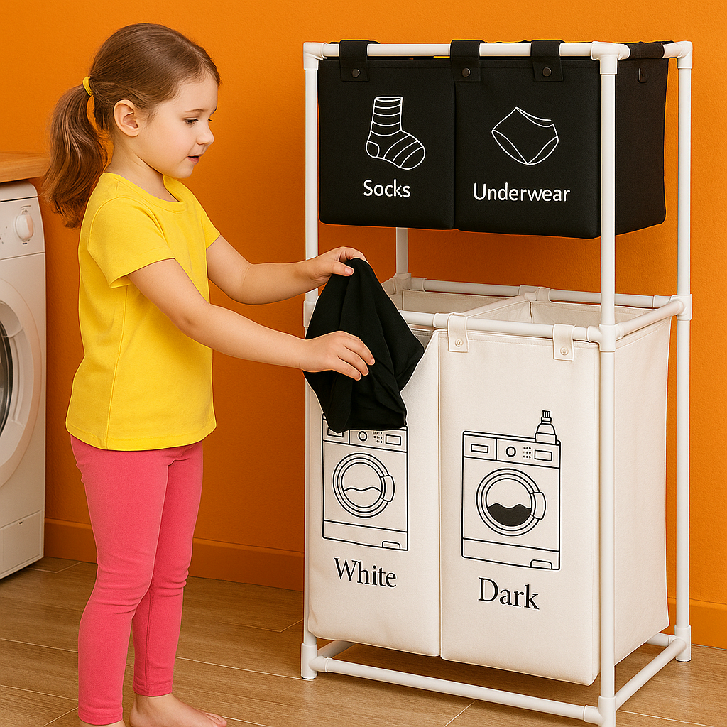 La cesta de 4 compartimientos y 2 niveles que mantiene todo bajo control. Separa blancos, oscuros, ropa interior y calcetines sin esfuerzo.